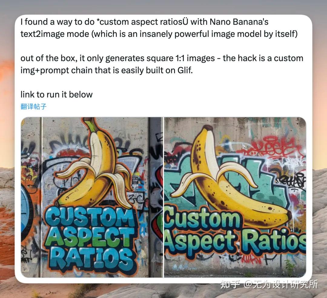 Nano Banana邪修最强科研成果!教你自定义生图比例! 作者: ciniao 时间: 2026-03-24 分类: AI文摘  转自:https://zhuanlan.zhihu.com/p/1946544618243068008 大家好,我是歸藏(guizang),今天教大家解决 Nano Banana 出图最大的问题。Nano Banana 已经非常强了,但是最近大家普遍用的时候两个问题非常影响可用性: 首先是分辨率较低,这个没啥办法,跟模型相关。然后是出图比例高度不可控,本来连续的图片因为比例不一样很难用到生产中。 我最近也一直在想怎么解决这个问题,前几天心里隐约有个想法,今天终于搞定了,话不多说先看结果:  ## 方法原理 用 Nano Banana 多的朋友可能发现了,就是 Nano Banana 在有多张图片输入的时候,输出图的比例会跟其中一张相同,只不过这个过程很不可控。 今天早上刚好看到一个英雄所见略同的,GLif 尝试用垫图的方式控制 Nan0 Banana 纯生成图片的比例,没想到真行,不过他们只支持文生图。藏师傅经过一顿科研发现已经生成好的图片也可以用这个方式去修改,你可以用这个方法重新跑一次拯救你的旧图,而且新生成的图片也可以再跑一次重新定义生成比例。  ## 所需素材 我们需要两张图片来完成这个任务: 首先肯定是你之前生成的结果图,或者是你从其他地方获取的图片只是想更改比例也可以的。比如我前几天做的这个 AI 书法舞女,由于书法字体每张截图都不一样大,导致生成的图片大小也不一样,很烦,为了生成视频我还得自己裁切,这样就容易丢失信息。  然后我们需要一张比例参考图,让 Nano Banana 将我们原来的内容替换到这张参考图上。他们长这样,这个图像内容我参考了 glif 的。但是他们的比例不全,我索性全部重做一遍,基本覆盖了所有常见比例,你也可以按这个样子自定义自己的比例,用 Figma 就可以很简单。 如果你懒得搞,文章最后有下载,我就不设置私信获取了,希望大家可以帮忙转发一下,谢谢 。  ## 操作步骤 两张图片素材都有了以后,就可以探索提示词该怎么写了,我先是让 Nano Banana 将图片替换到比例模板图上,结果发现,会有类似的蓝色边,他没有帮我们扩图,只是简单的拼贴。  于是在藏师傅疯狂迭代和尝试下,新生成的图片会基于原有图片的内容填充新的内容,适应更改后的比例。 提示词为: ``` Redraw the content of Figure 1 onto Figure 2, add content to Figure 1 to fit the aspect ratio of Figure 2, completely clear the content of Figure 2, and only retain the aspect ratio of Figure 2. ``` 这里需要注意图片的顺序,想要修改的图放第一张,比例图放第二张,放反的话可能出问题。在 AI Studio 上使用的就是下图这样。  ## 完整流程总结 这就是教程的全部内容了,我们再来复习一下过程: 1. 准备好你想要更改比例的图片以及对应的比例模版图 2. 将想要更改比例的图片放第一张,将比例模版图放第二张,不建议更改顺序 3. 输入提示词:"Redraw the content of Figure 1 onto Figure 2, add content to Figure 1 to fit the aspect ratio of Figure 2, completely clear the content of Figure 2, and only retain the aspect ratio of Figure 2." 藏师傅实验了一早上,应该没问题,偶尔会出现生成的图片有蓝色背景,这时候多抽一次就行。 另外在 Gemini APP 中用 Gemini2.5 Pro 模型调用 Nano Banana 效果要比 AI Studio 要好一些,有条件可以用这种方式。  ## 资源下载 你可以在这里下载所有比例的案例图:https://pan.quark.cn/s/163037f3 8e88 提取码:7tJV 感谢各位的浏览,希望可以给藏师傅一个转发,分享给同样需要这些内容的朋友。 标签: none